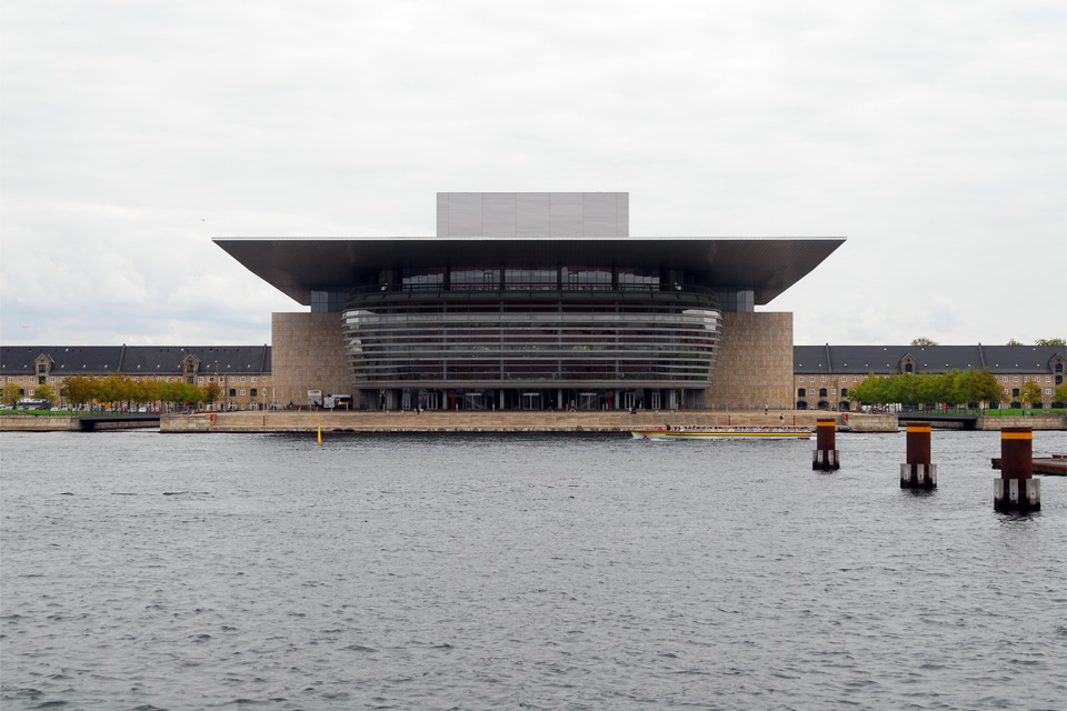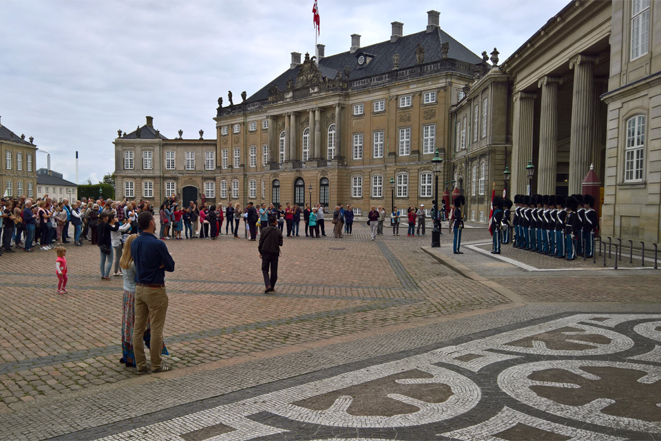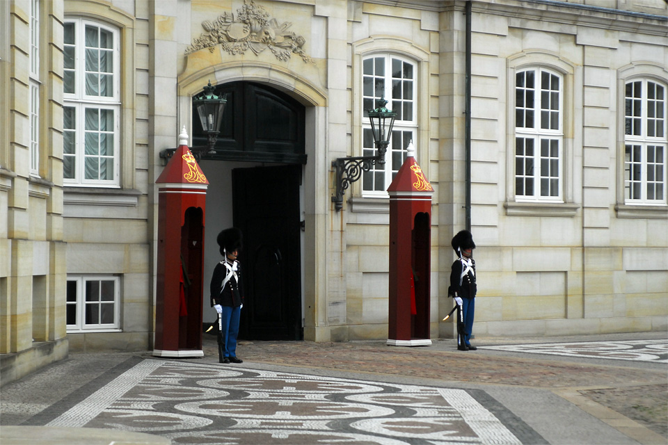 A Márvány-templom kijárata a Frederikgade-ra néz, ezen átsétálva a királyi palota-együtteshez jutunk, de ezen a tengelyen található a koppenhágai Opera is a csatorna túloldalán. Az Amalienborg a dán királyi család lakhelye. Valójában négy palotából áll, amelyek egy teret ölelnek körül, amely közepén V. Frederik lovasszobra áll. Amikor odaértem épp őrségváltással próbálták elterelni a turisták figyelmét, hogy amíg ők a tér egyik oldalára özönlenek, a királyi konvoj a tér másik oldalán zavartalanul kihajthasson a palotából. Nekem legalábbis így festett a dolog. Azt nem tudom, hogy a királyi család tagjai ebben a konvojban voltak-e, vagy egy későbbiben, ami a Dán Királyi Színházba tartott, és ami miatt a környék, az útvonal és a színház melletti utcák tele voltak fegyveres rendőrökkel és fekete autókkal.