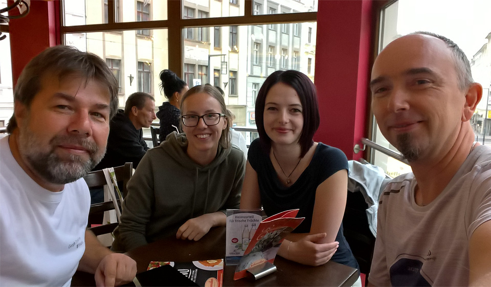 A reggeli után készítettünk egy közös képet, elbúcsúztunk. Mi összeszedtük a dolgainkat, bezártuk az istállót, a kulcsokat hátrahagytuk a megbeszélt helyen, és tovább indultunk. Először csak Görlitzbe, ahol Elisa-val beszéltünk meg egy találkozót, ő is a Jugendscheune csapat önkéntes tagjaként járt többször Nagygalambfalván. A megbeszélt helyen várt ránk, leparkoltuk az autót, és épp elindultunk egy kávézót keresni, amikor egy sarkon Lenába botlottunk. Míg Florian egy kollégájával folytatott szakmai beszélgetést, Lena sétálni indult az óvárosba. Így már négyesben ültünk be a Café Centralba.
